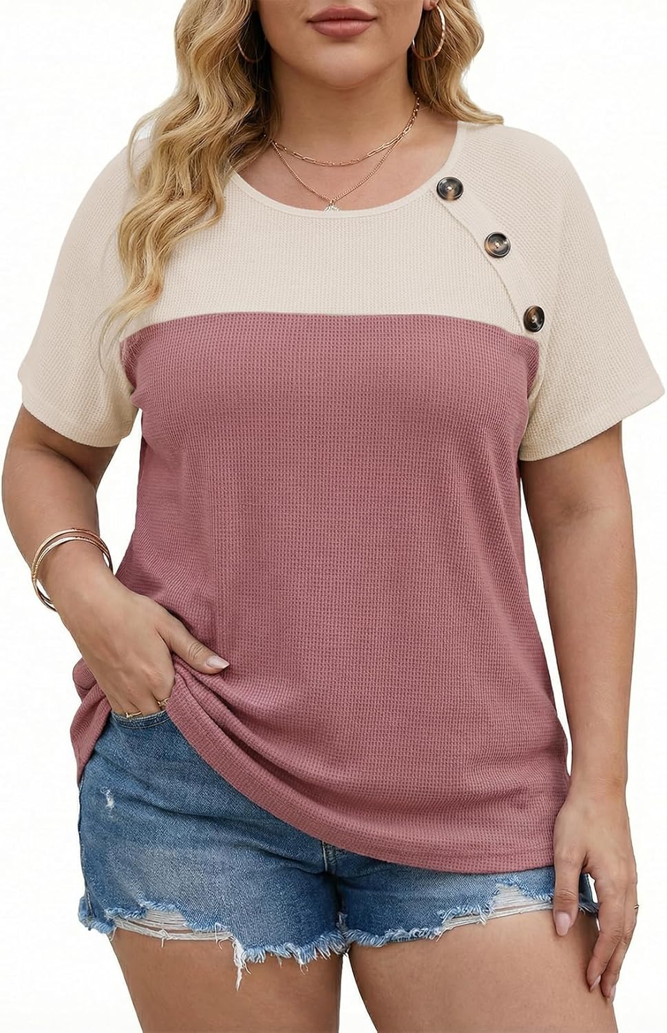 Eytino Womens Plus Size Summer Tops Color Block Crewneck Short Sleeve Loose Fit Tshirts,1X-5X
