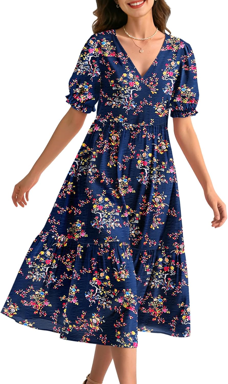 Womens Summer Short Sleeve Midi Dress High Waist A-Line Casual Dresses 2026 Beach Outfits with Pocktes