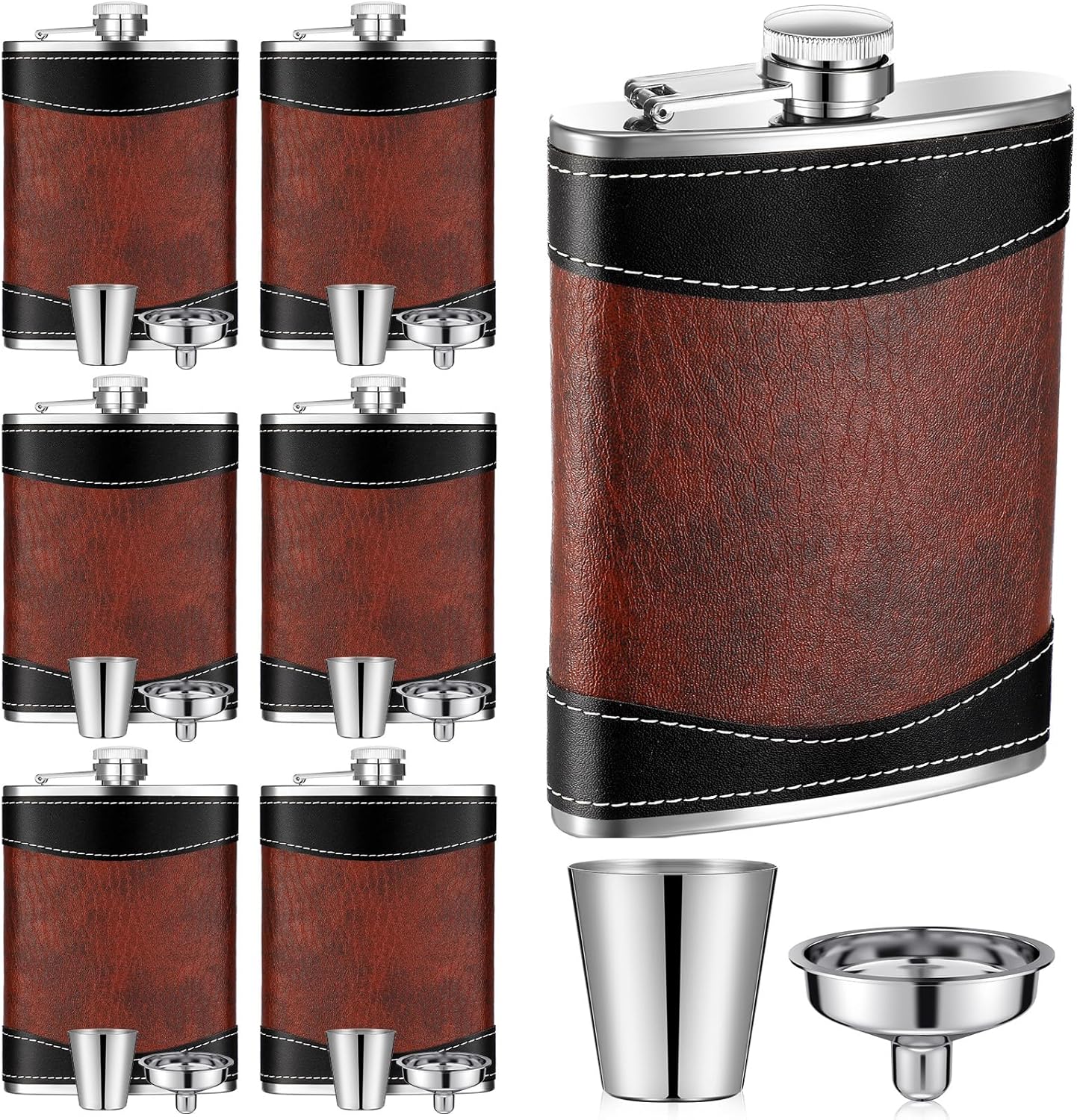 6 Set 8 oz Leather Wrapped Hip Flasks for Liquor Leak Proof Stainless Steel Whiskey Flasks with 1 oz Cups and Funnels Set of 6 Groomsman Proposal Gifts for Men Father Birthday Wedding