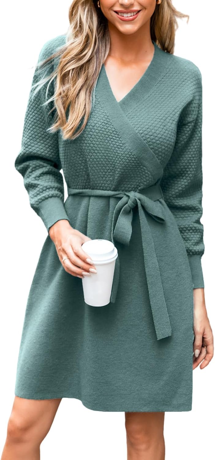 CUPSHE Womens Casual Fall Dress 2024 V Neck Long Sleeve Ribbed Knit Belted Fitted A Line Pullover Midi Sweater Dress