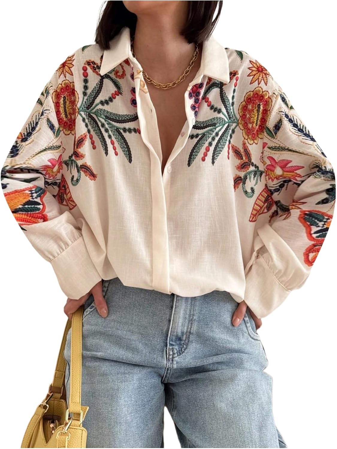 MakeMeChic Women's Floral Button Down Shirt Long Sleeve Collared Business Dressy Blouse Tops