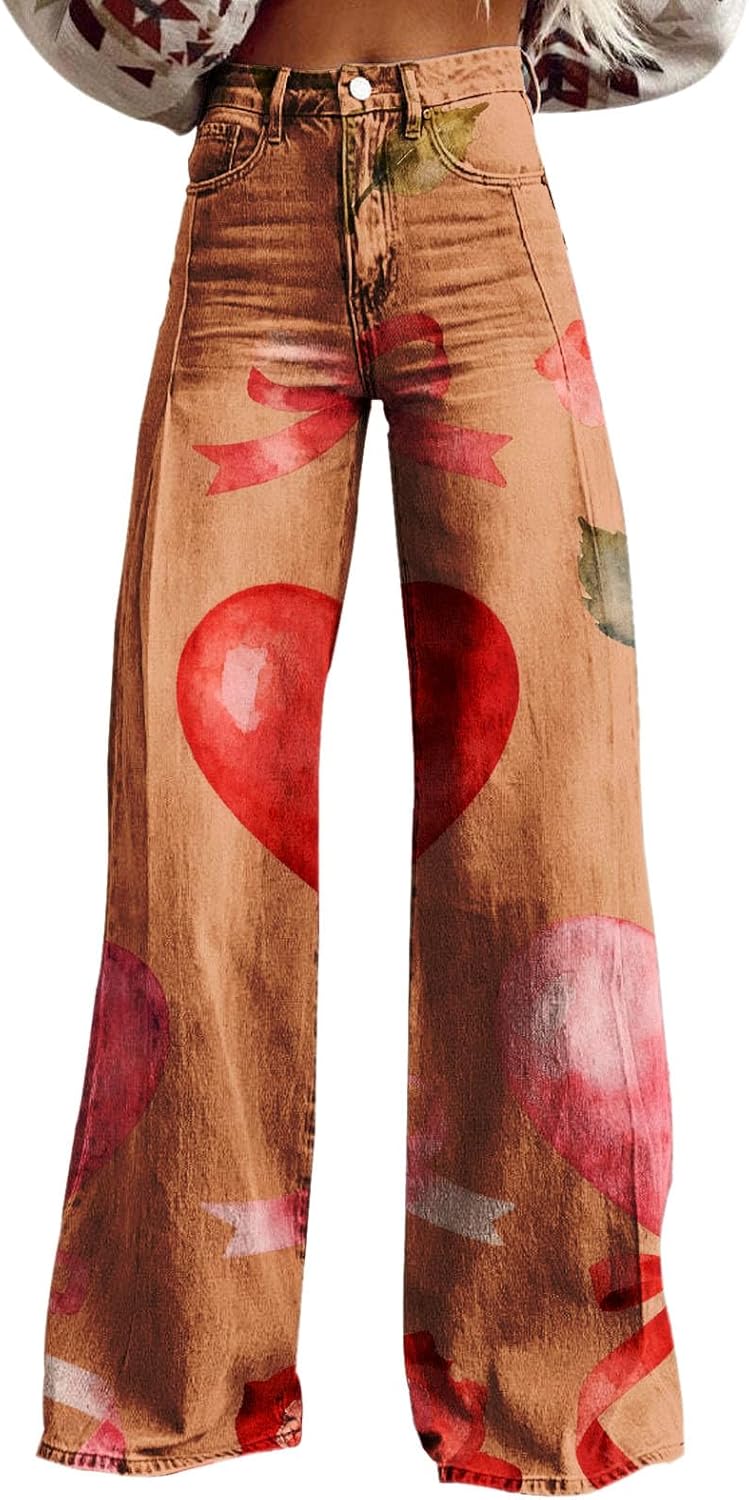 Wide Leg Denim Look Flare Jeans Women Plus Size Stretchy High Waisted Distressed Valentines Heart Jeans for Women