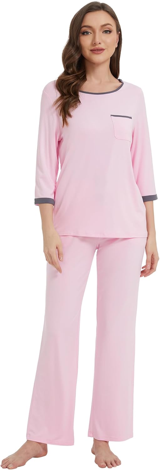 WiWi Womens Pajamas Viscose from Bamboo Super Soft Pajama Set 3/4 Sleeve Sleepwear Cooling Pjs with Pockets S-XXL