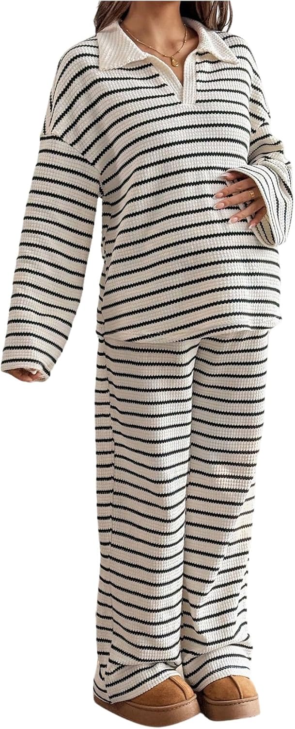 MakeMeChic Women's Maternity Fall Outfits Striped Long Sleeve Collar V Neck Blouse and Pants 2 Piece Sets