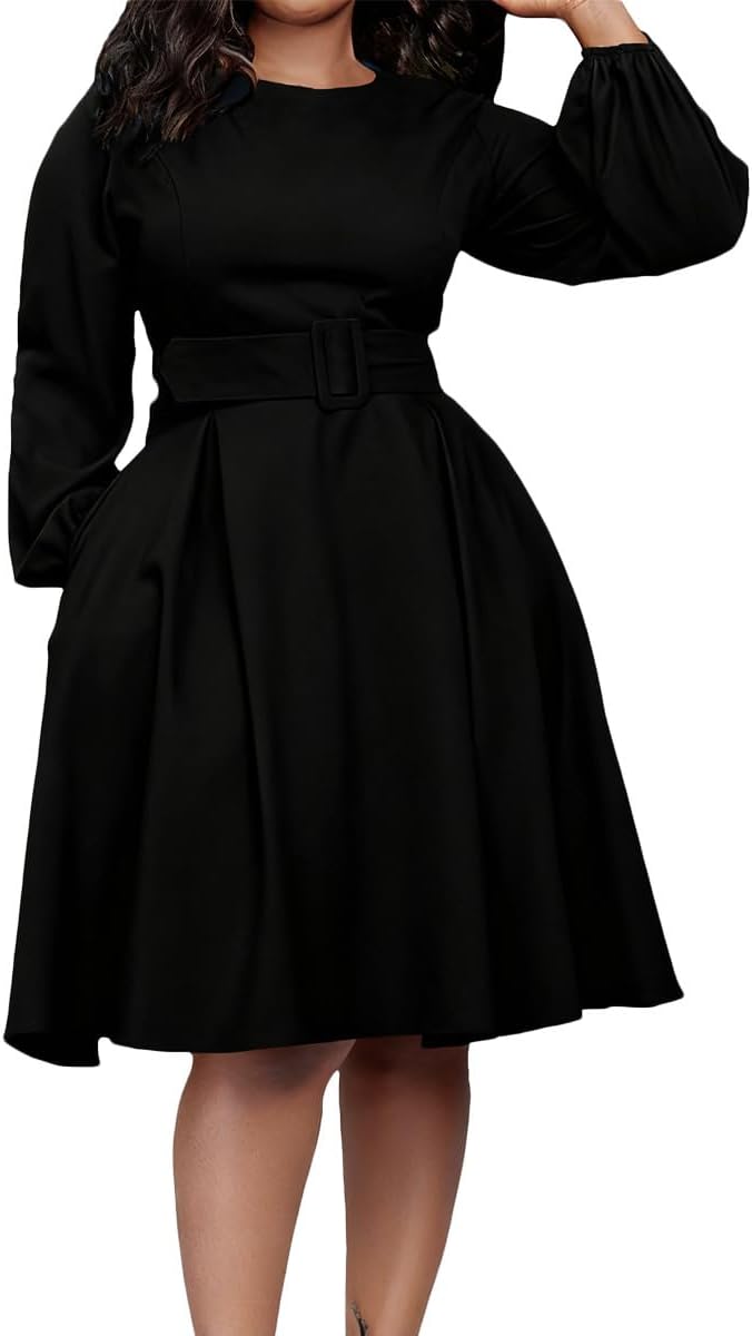 Elainone Women Long Sleeve A Line Dress with Belt Church Wedding Guest Semi Formal Office Dresses