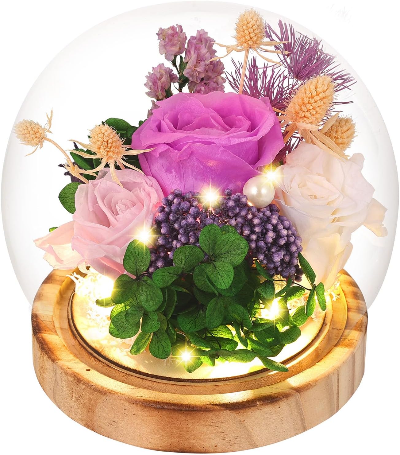 - Eternal ROSE Gifts Friendly for flower lovers who are not good at floriculture. No need daily maintenance, no cause pollen allergies, will not wither, just always beauty. Our preserved flowers bouquet in glass dome are designed with warm and soft yellow LED lighting, as a decorative craft with natural elements, it can exert a positive effect to emotion and creative power, it’s a gift to feel be loved, choose the Forever flower for the special people, love and friendship