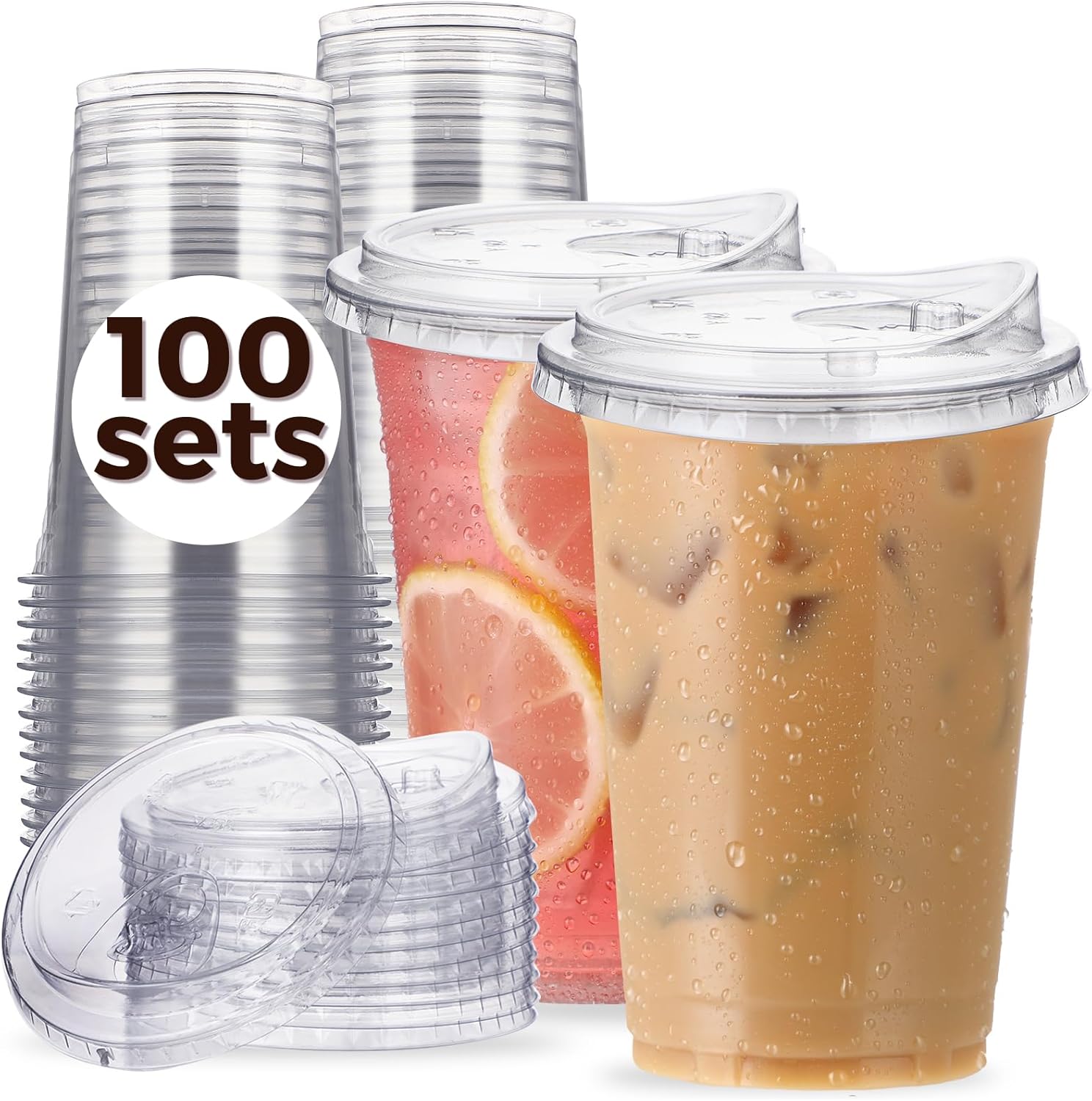 - Strawless design provides a more comfortable drinking experience: The sip lid has a small flap cap. Compared to the lid without this cap, this design ensures the beverage inside is not easily spilled during use. What's more, this cap prevents small bugs from flying into your drinks! And the opening is the perfect size for drinking without side mouth drips while it is large enough for all sizes of straws. Package includes: 100 clear plastic cups (20 oz), 100 lids.