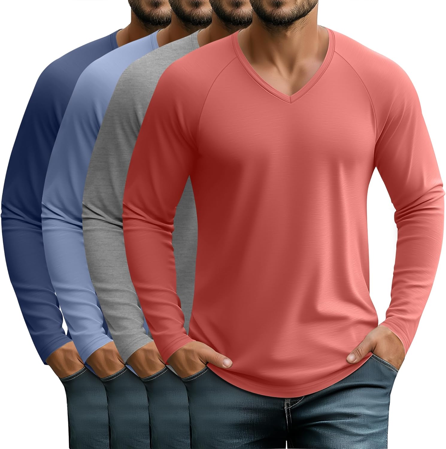 4 Pcs Mens Long Sleeve V Neck Shirts Raglan Sleeve Curved Hem Tees Lightweight Casual Basic Workout T Shirts