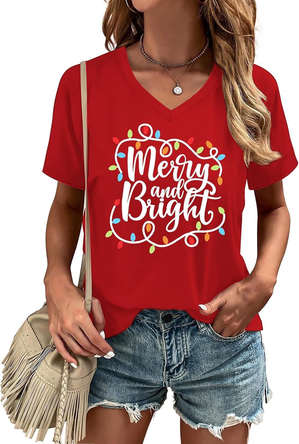 Christmas Shirts for Women: Merry Christmas V Neck T Shirt Xmas Tree Graphic Tees Christmas Vacation Short Sleeve Tops
