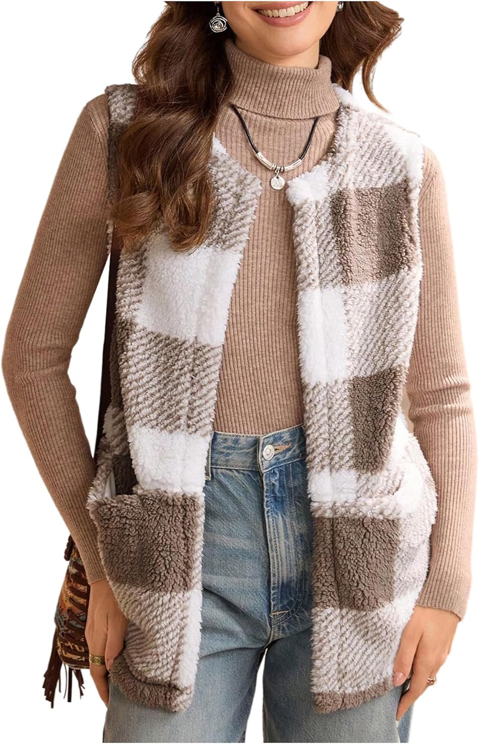 Verdusa Women's Gingham Plaid Teddy Jacket Furry Fuzzy Vest Sleeveless Winter Coats with Pockets