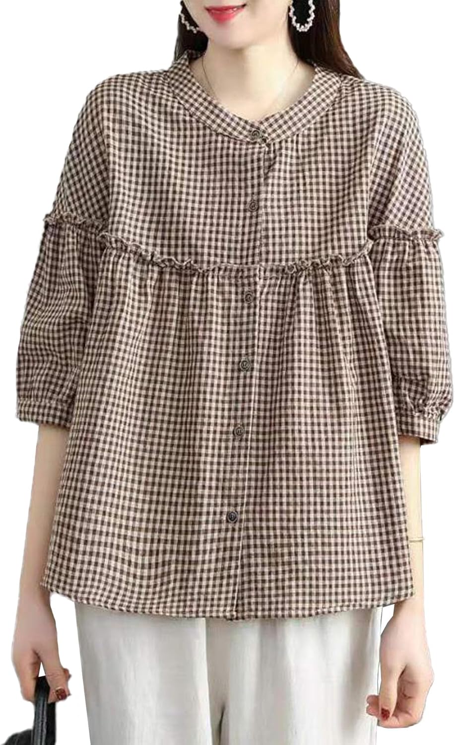 SOMTHRON Women's Casual Plaid Button Down Shirts Ruffle Trim Loose Fit 3/4 Sleeve Checkered Blouses Tops