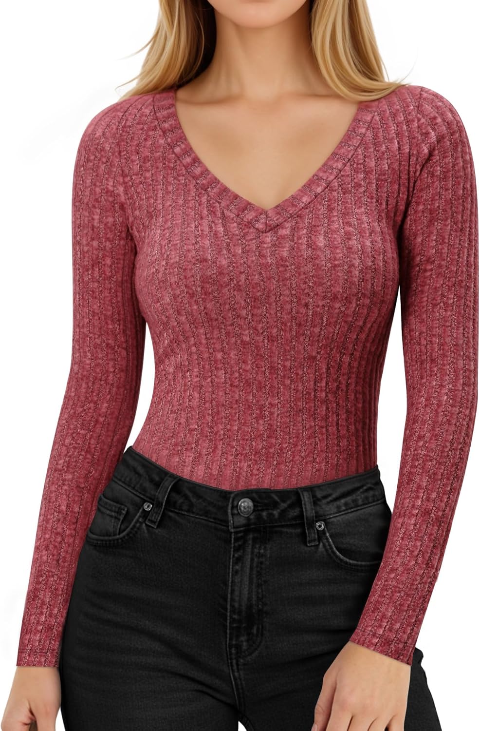 MANGOPOP Long Sleeve T Shirt Women V Neck Shirt Lightweight Ribbed Fitted Sweaters Fall Fashion 2025