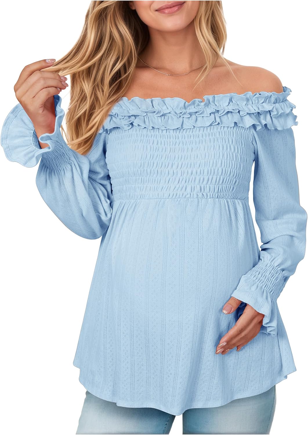 OUGES Womens Cotton Blend Off The Shoulder Maternity Tops Smocked Ruffle Sleeve Blouse Going Out Pregnancy Shirts 2025