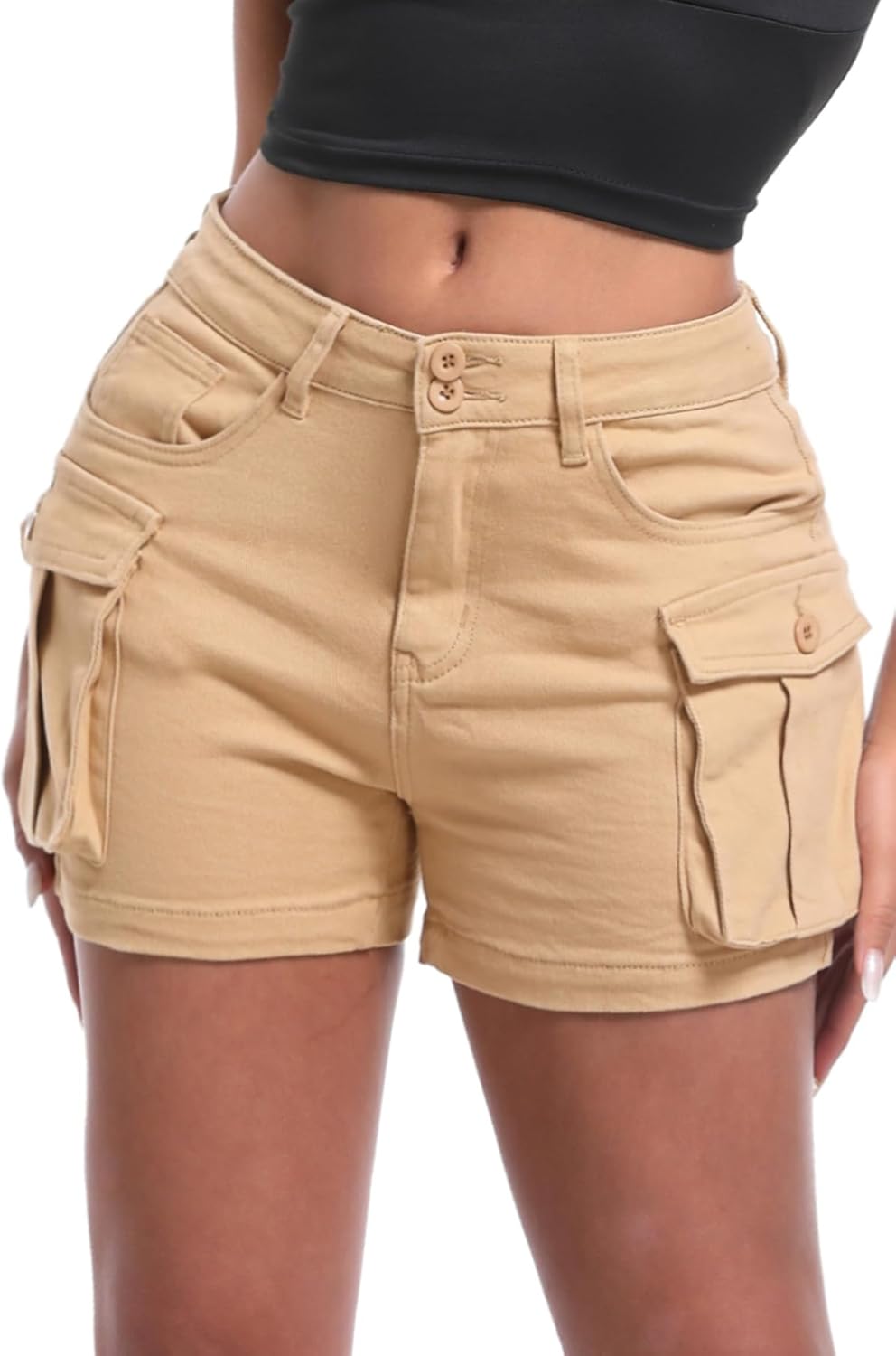 ELLEVEN Women's High-Stretch Cargo Shorts, Y2K Mini, High Waisted, Slim-Fitted Jean Shorts with Pockets