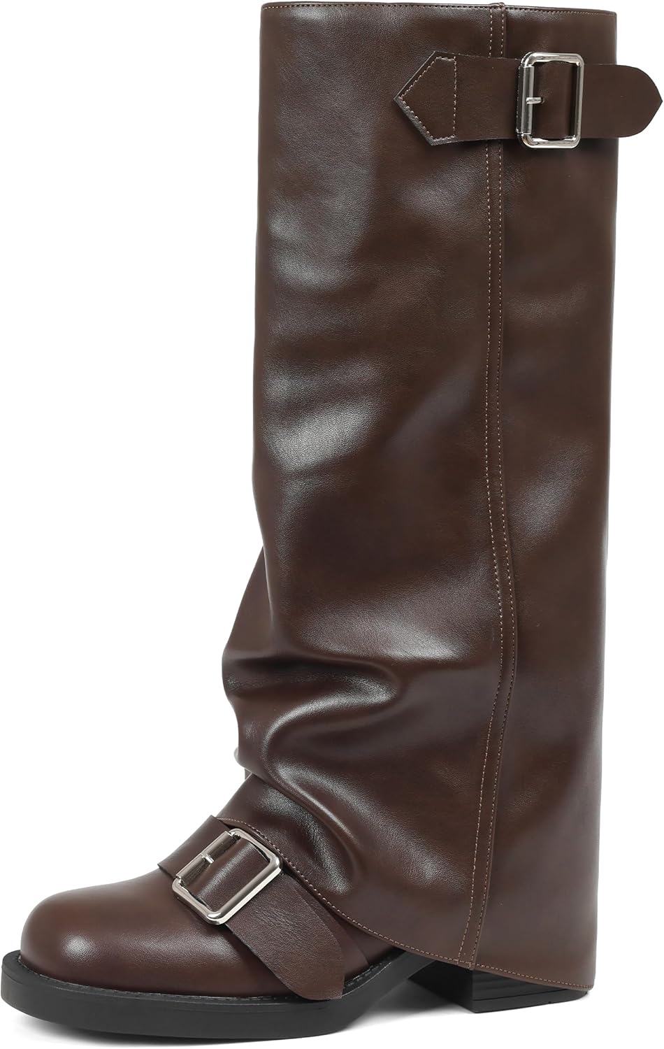AMINUGAL Fold Over Knee High Boots Women Chunky Block Heel Festival Trendy Casual Round Toe Buckle Tall Slouchy Boots for Women Motorcycle Riding Rave Club Pull on Y2K Long boots