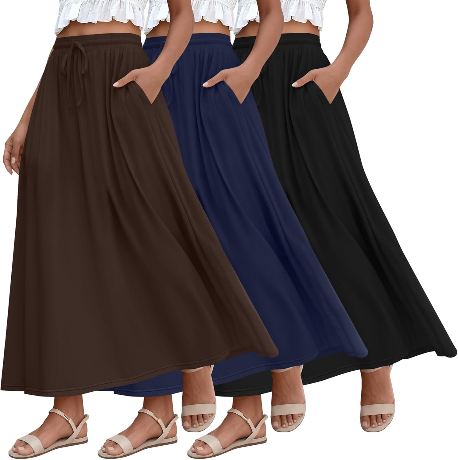 Ficerd 3 Pack Women's Maxi Long Skirts, Ankle Length a Line Elastic High Waist Summer Casual Drawstring Skirts with Pockets