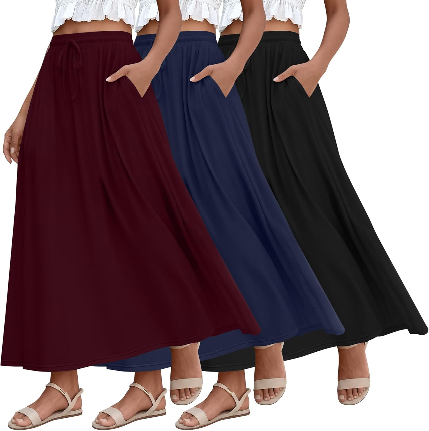 Ficerd 3 Pack Women's Maxi Long Skirts, Ankle Length a Line Elastic High Waist Summer Casual Drawstring Skirts with Pockets