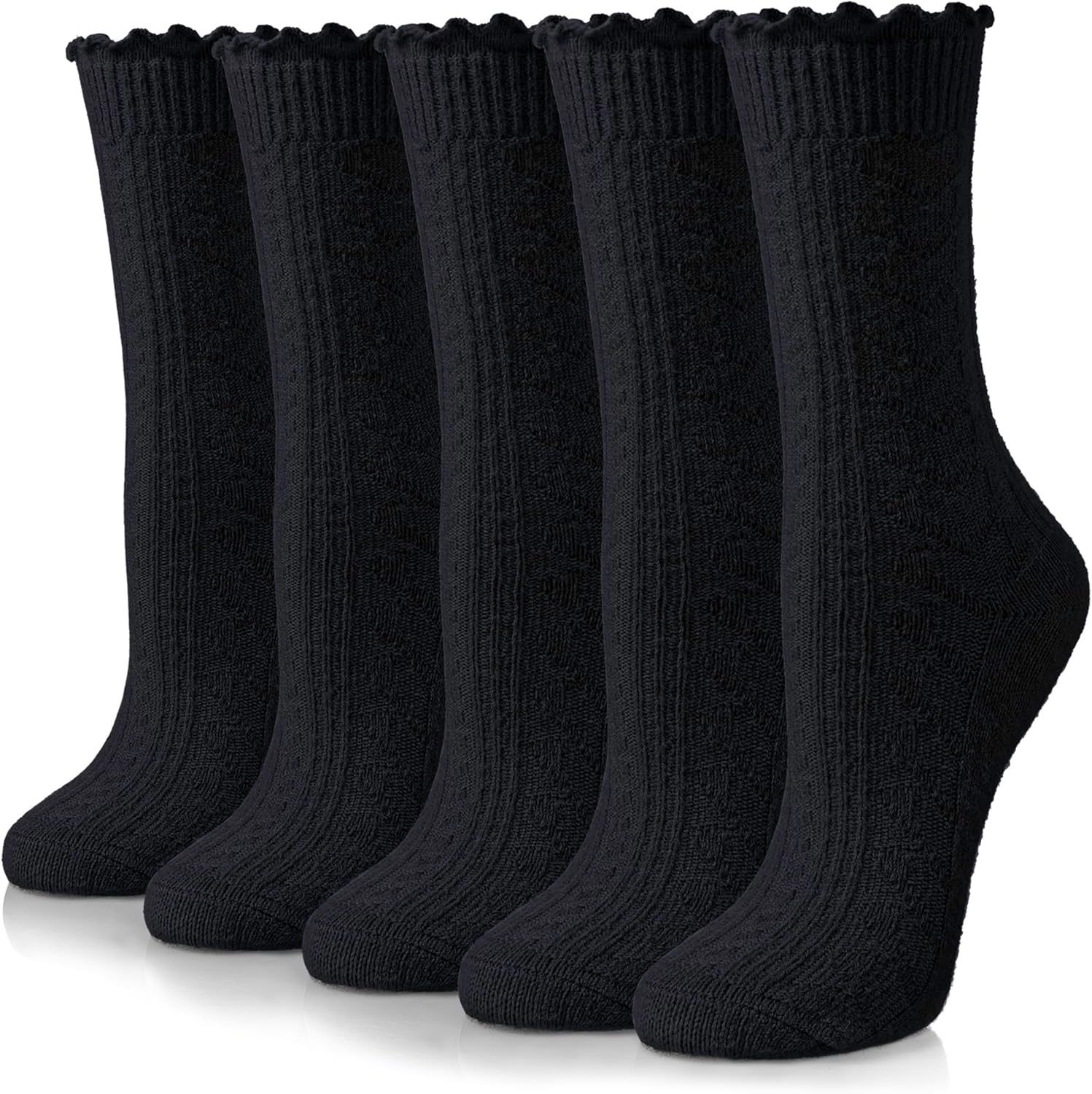 Eyean Womens Merino Wool Ruffle Socks Knit Warm Boot Winter Cozy Thermal Hiking Dress Crew Frilly Socks 5 Pairs