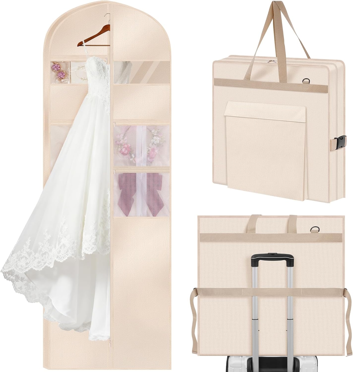 - Multi-Functional Storage:The TANGKA dress bag features 7 pockets for maximized storage. It accommodates accessories like collars, brooches, crowns, scarves, belts, gloves, socks, necklaces, hats, shoes, toiletries, jewelry, and cosmetics, meeting diverse storage and travel needs