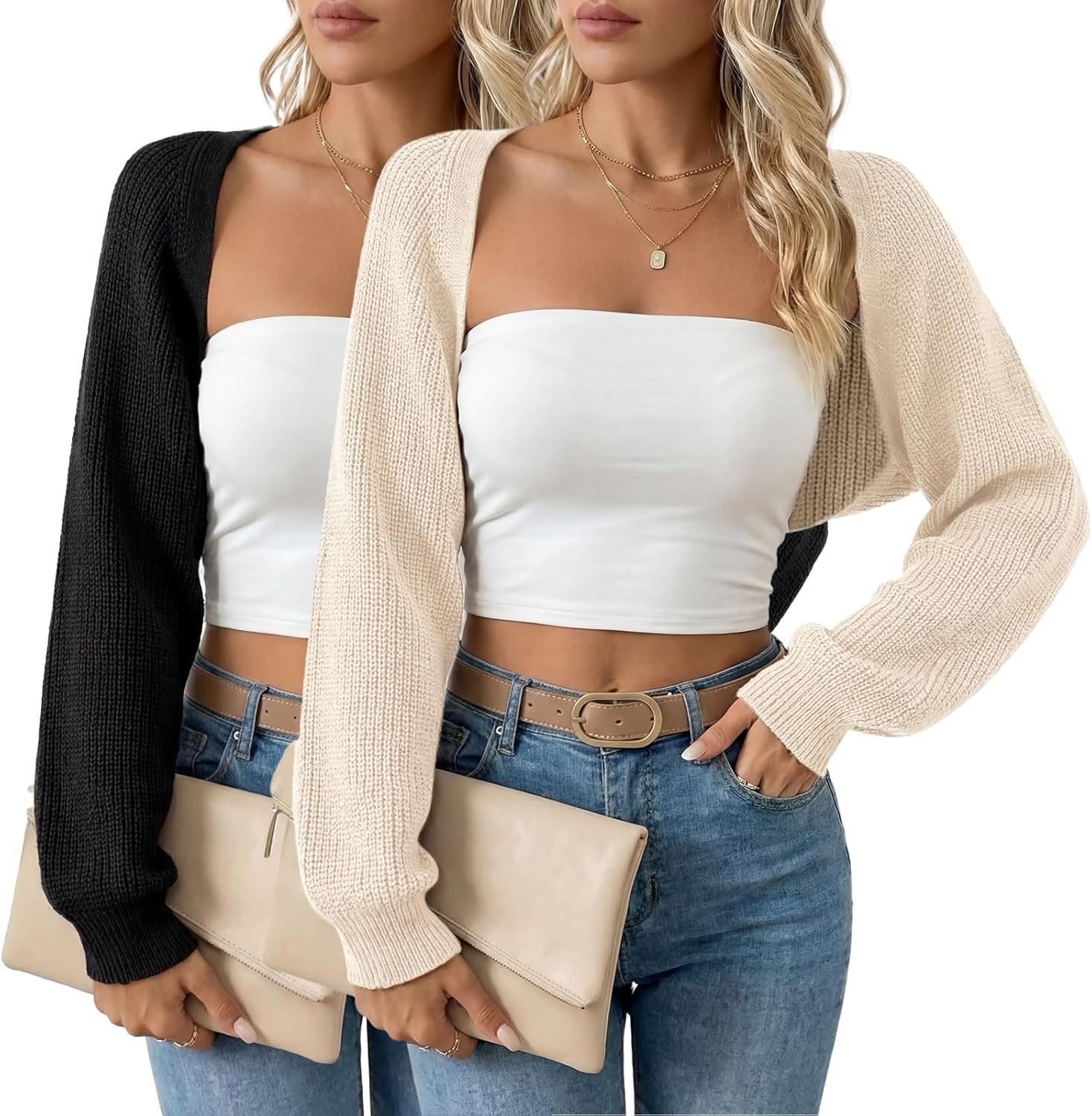 2 Pack Womens Cardigan Shrugs Long Sleeve Knit Open Front Cropped Bolero Drop Shoulder Loose Fit Cardigan