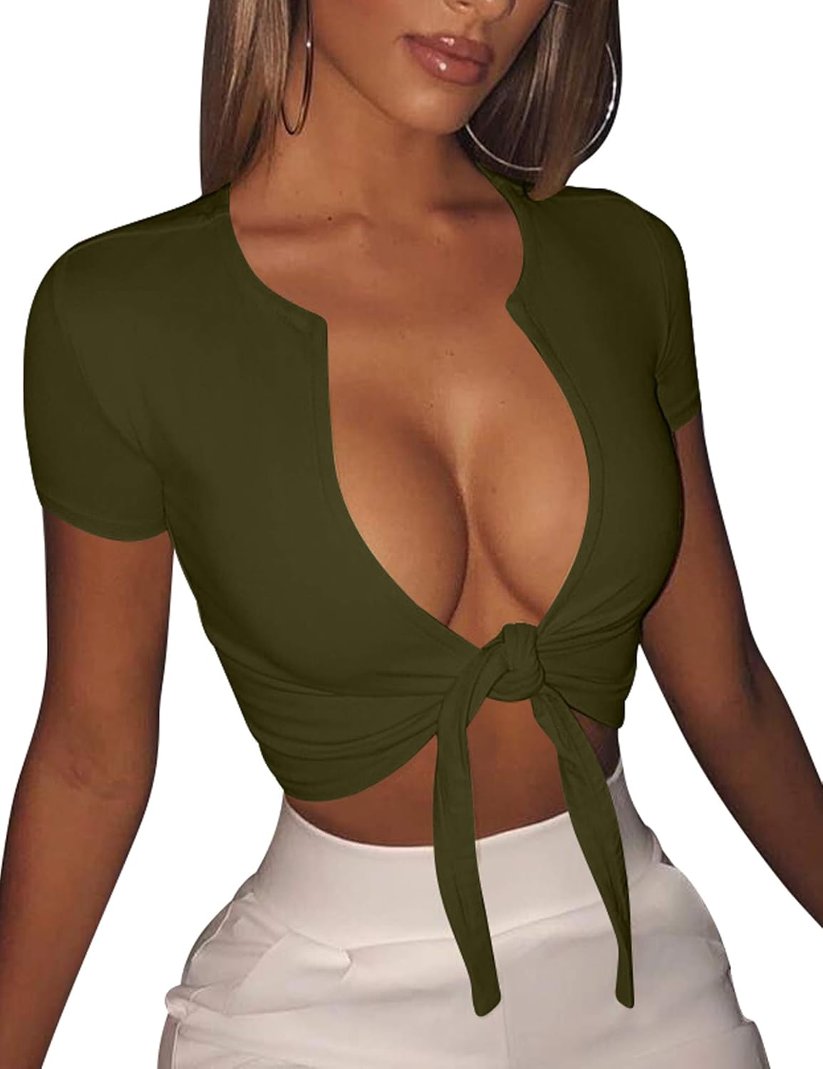 BORIFLORS Women's Sexy Tie Up Crop Top Short Sleeve Deep V Neck Casual Basic T Shirt