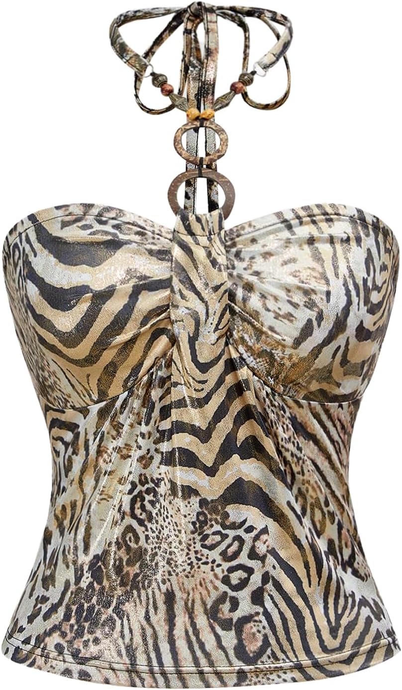 SOLY HUX Women's Leopard Print Halter Top Y2k Ruched Tie Backless Sleeveless Slim Fit Going Out Tops