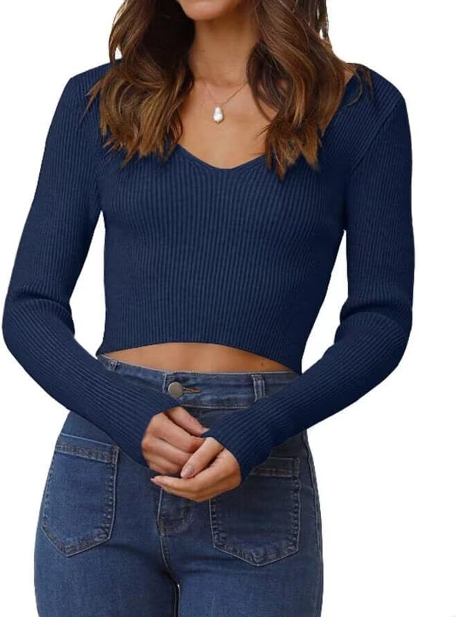 Ezbelle Womens Sweaters V Neck Shirts Sexy Top Chunky Sweater Lightweight Long Sleeve Clothes Navy Blue L