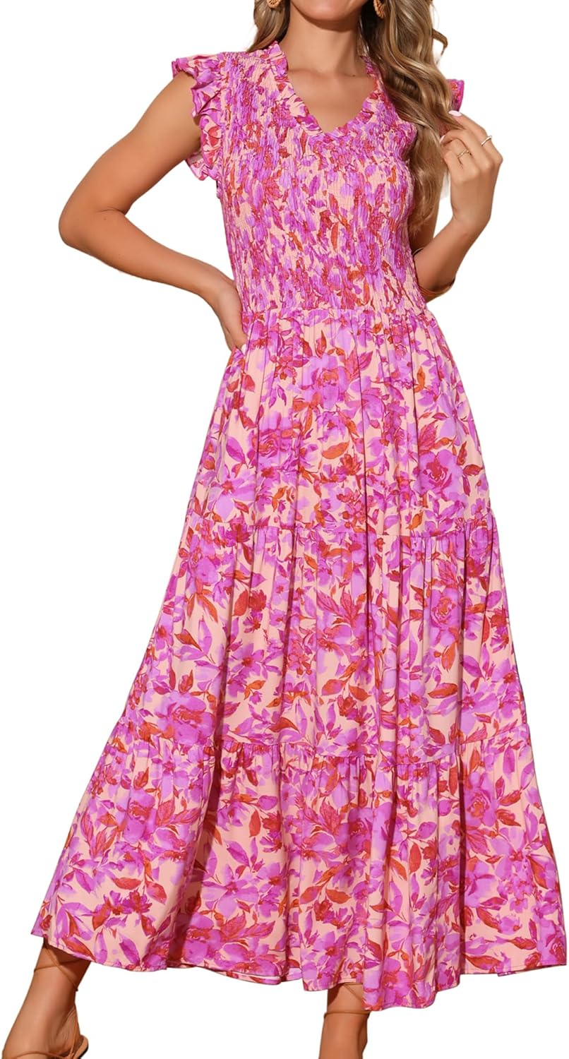 Seta T Women's Summer Dresses Casual Cap Sleeve V Neck Smocked Floral Ruffle Tiered Flowy Beach Maxi Dress