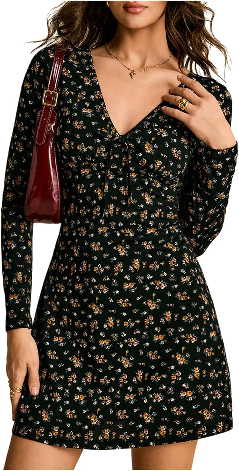 Floerns Women's Floral V Neck Long Sleeve A Line Mini Dress Daisy Short Fall Dresses