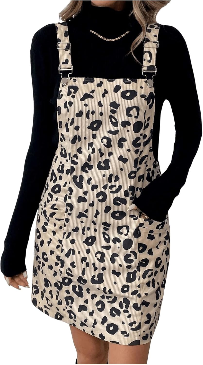OYOANGLE Women's Leopard Print Overall Dress Adjustable Strap Pinafore Dresses with Pocket