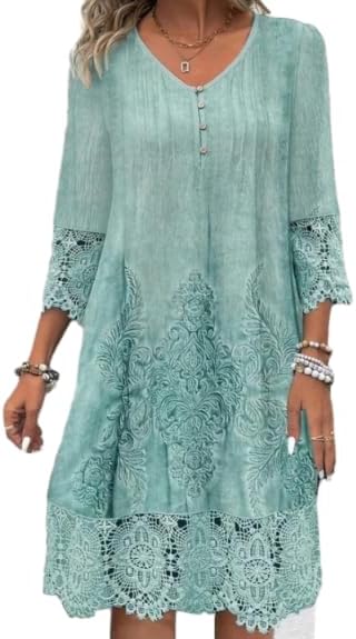 Women's V Neck 3/4 Sleeve Embroidered Midi Dress Boho Lace Trim Washed Tunic Dress Vintage Loose Fit Peasant Dress