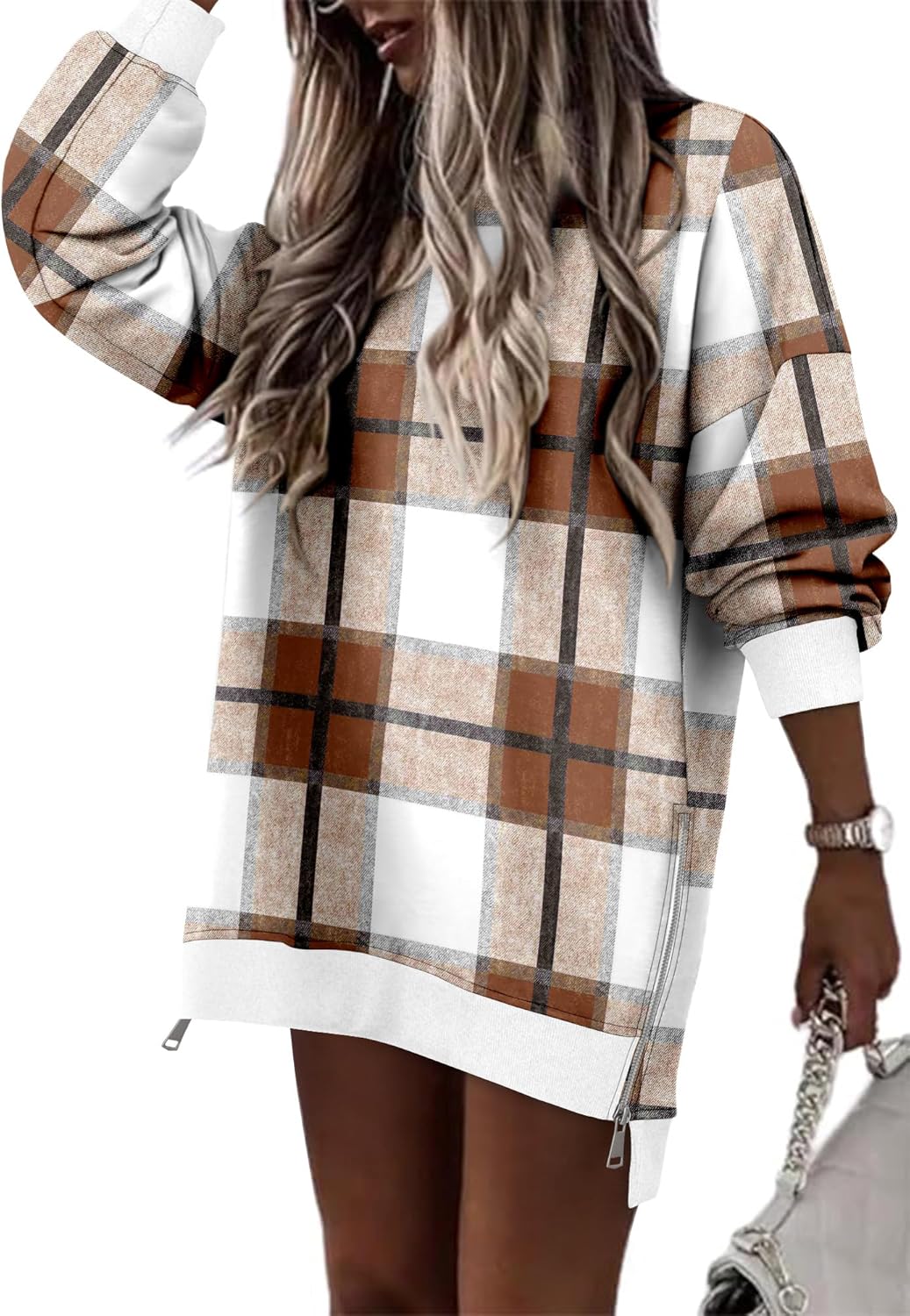 CHICZONE Crew Neck Oversized Sweatshirt Zipper Slit Long Sleeve Pullover for Women 2025 Trendy Fall Clothes