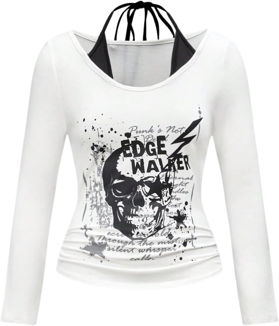 SOLY HUX Women's Graphic Tees Y2k Gothic Halter Tops Long Sleeve Going Out T Shirt Punk Vintage Alternative Clothes