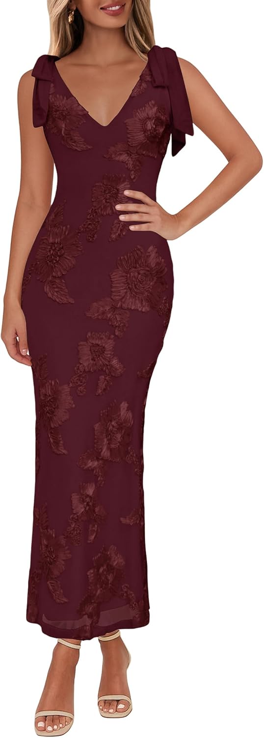 Lazysmile Womens Floral Embroidered Maxi Dress Sleeveless V Neck Tie Strap Ribbon Flower Mesh Party Cocktail Dresses