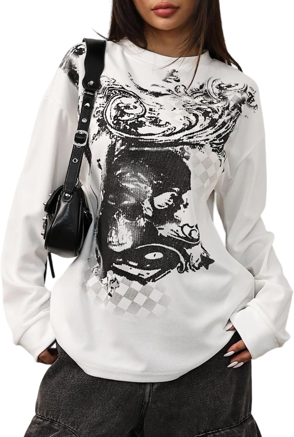 SOLY HUX Women's Gothic Oversized Tops Long Sleeve Crew Neck Graphic Tee Shirts Y2k Grunge Clothes