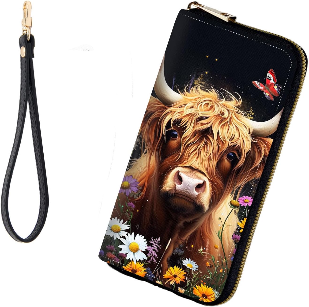 RFID-Blocking Zip Around Wallets for Women with Detachable Wrist Strap, Large Capacity Credit Card Holder for Secure Everyday Use,Cute Floral Highland Cow