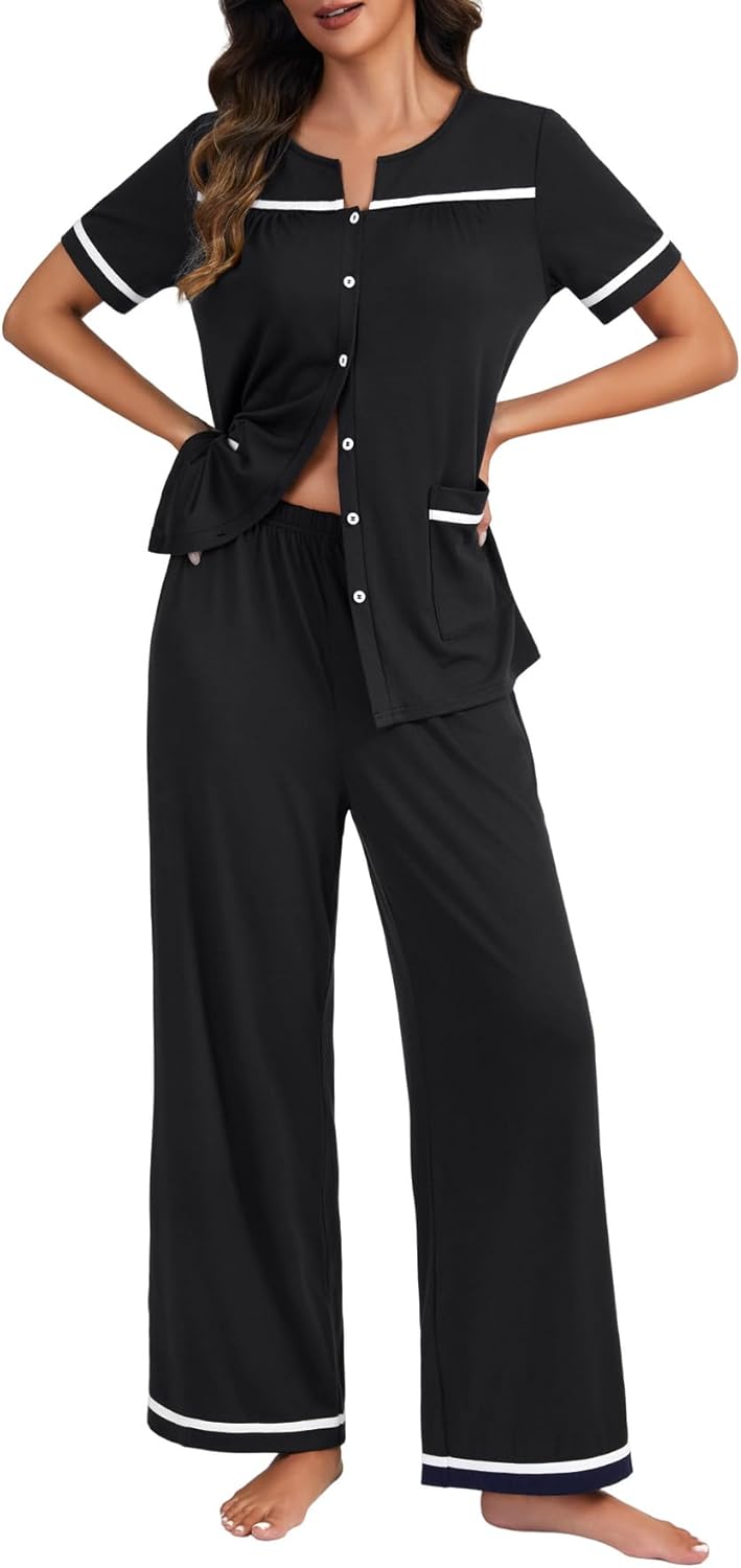 LYANER Women's 2 Pcs Pajama Sets Short Sleeve Buttons Shirt And Leisure Long Pants