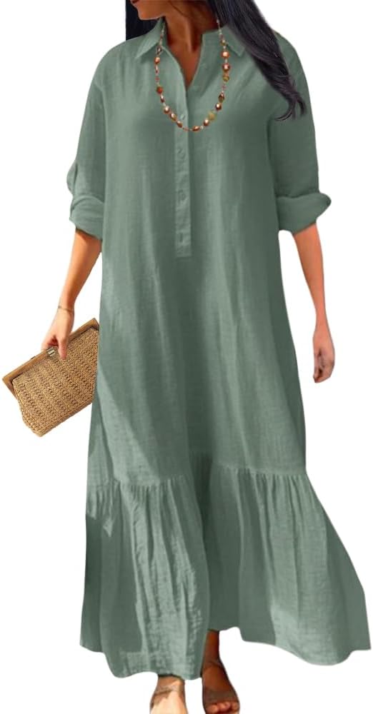 ZOCANIA Linen Dress Women Cotton Dress Casual Button Down Linen Shirt Dress Long Sleeve Plus Size Collared Maxi Dresses
