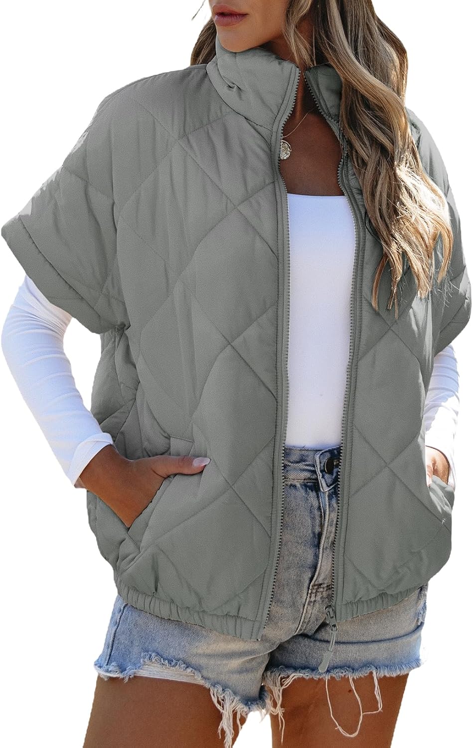 SHEWIN Quilted Jackets For Women 2025 Casual Lightweight Short Sleeve Zip Up Warm Vests