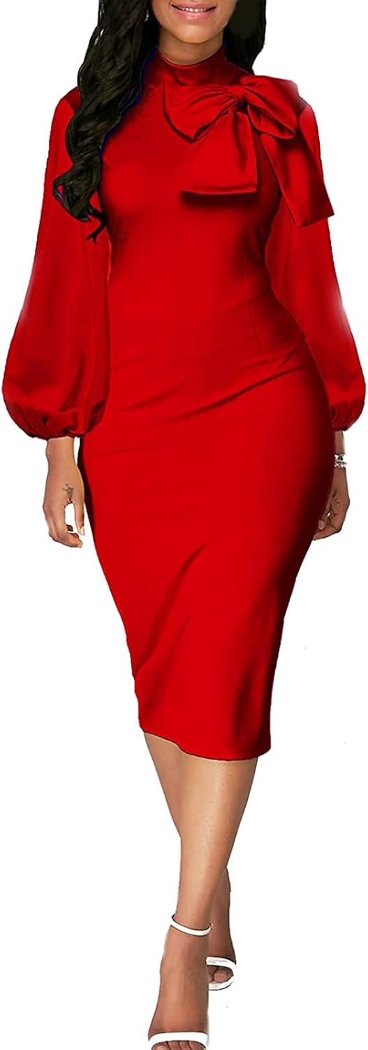 BestGirl Women's Bishop Sleeve Bodycon Dresses Work Casual Floral Print Pencil Midi Dresses