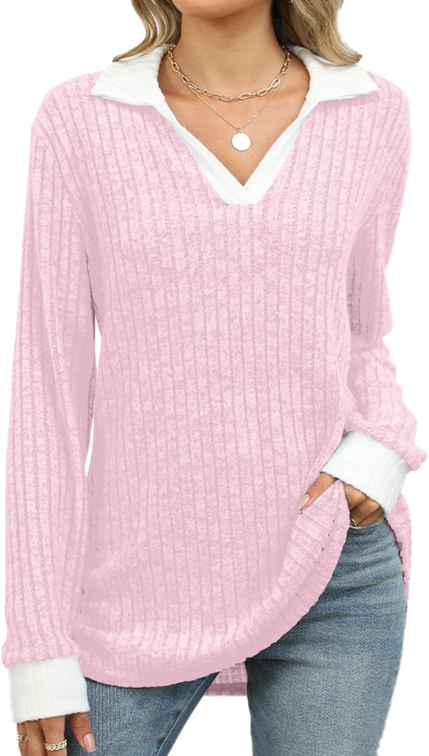 BAISHENGGT Women's Contrast Collared Shirts Casual Long Sleeve Ribbed Fall Tops Lightweight Tunic Sweaters