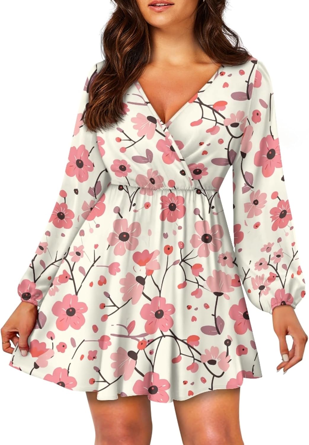 Lantern Sleeve Dress for Women Floral 2025 Fashion Empire Waist Swing Flowy Ruffle V Neck A Line Holiday Mini Dress