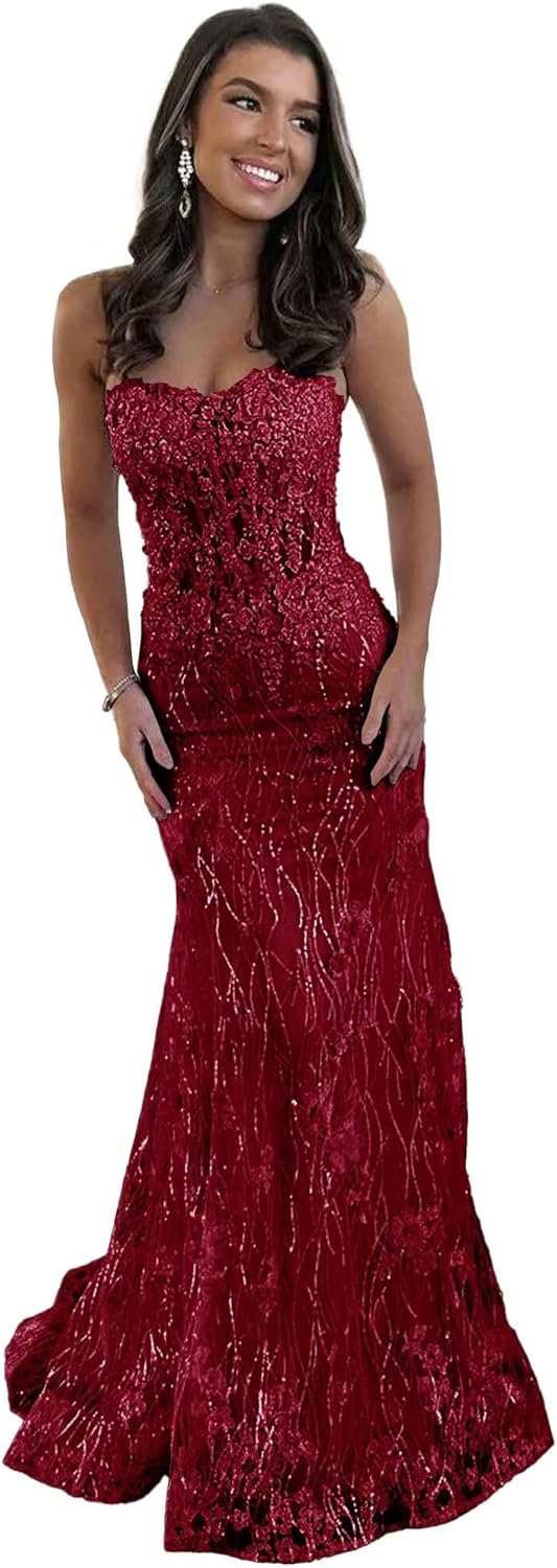 Mermaid Sequin Lace Appliques Long Prom Dresses for Teens Corset Strapless Evening Party Dress
