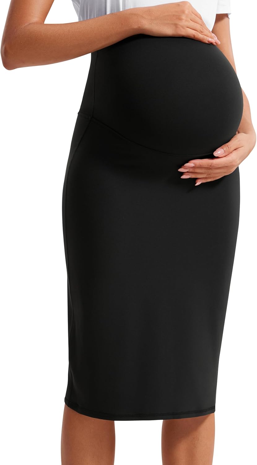CRZ YOGA Women's Butterluxe Maternity High Waist Casual Golf Work Midi Skirts Over The Belly Pregnancy Split Stretchy