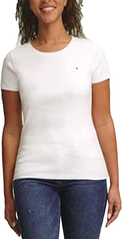 Tommy Hilfiger Womens Crew Neck Solid Color Logo T-Shirt Short Sleeve Cotton 1483915 (White, Large)