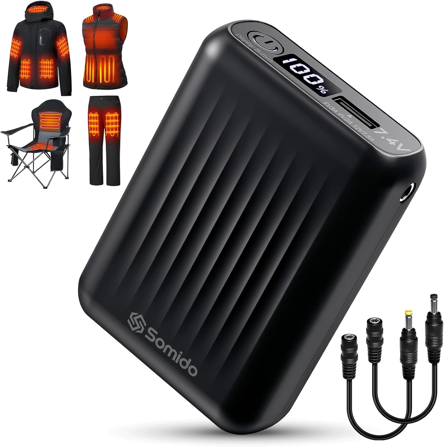 - 【🔋 Lasts up to 12 Hours&Pocket Size】Somido 18400mAh battery pack is suitable for 7.4V heated devices, low lasts up to 12 hours.Size only 1.1*2.7*3.5 inch, weight only 0.63 lbs.Compact size and large capacity, effortlessly provides all-day power for indoor and outdoor winter activities