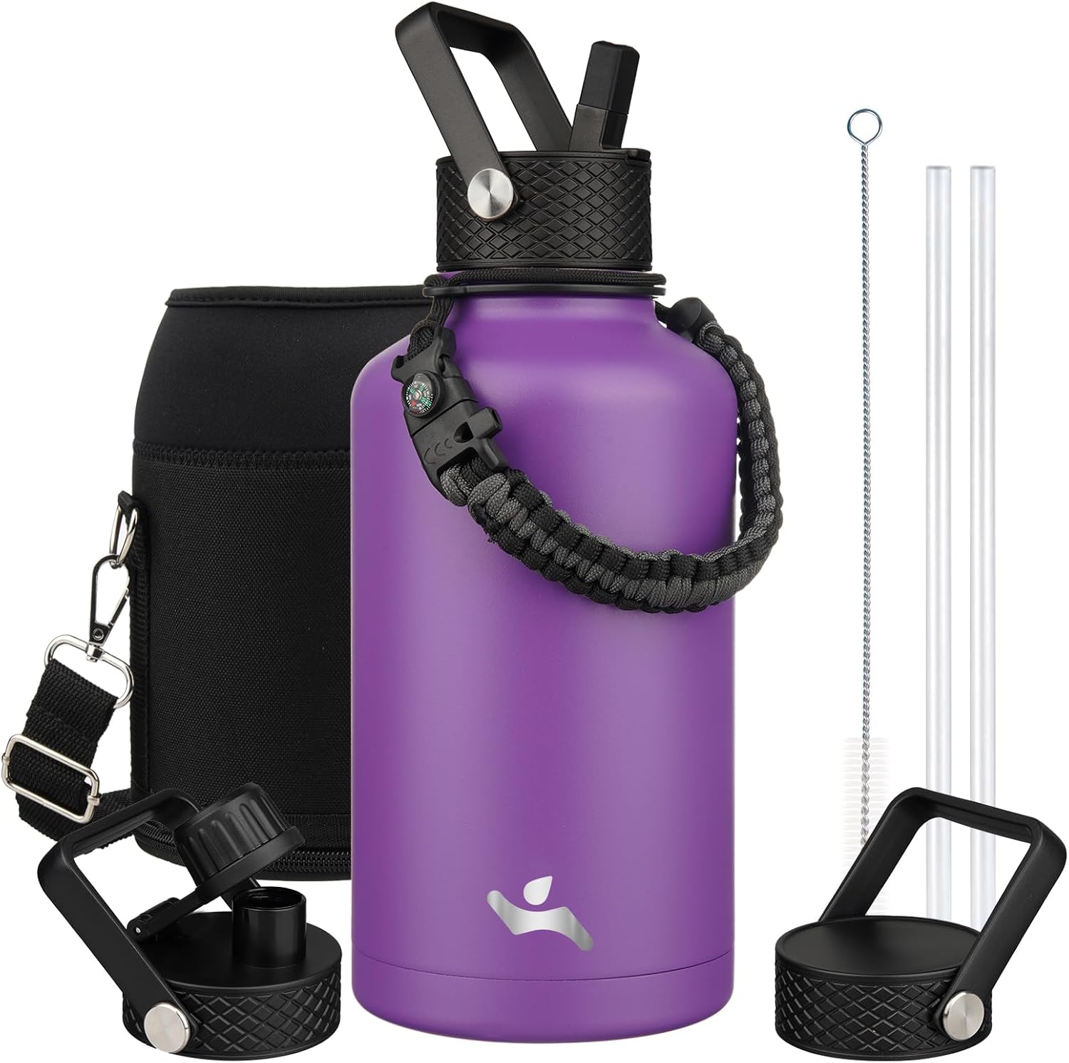 Half Gallon Insulated Water Bottle with Straw,64 oz 3 Lids Water Jug with Carrying Bag,Paracord Handle,Double Wall Vacuum Stainless Steel Metal Flask,Purple