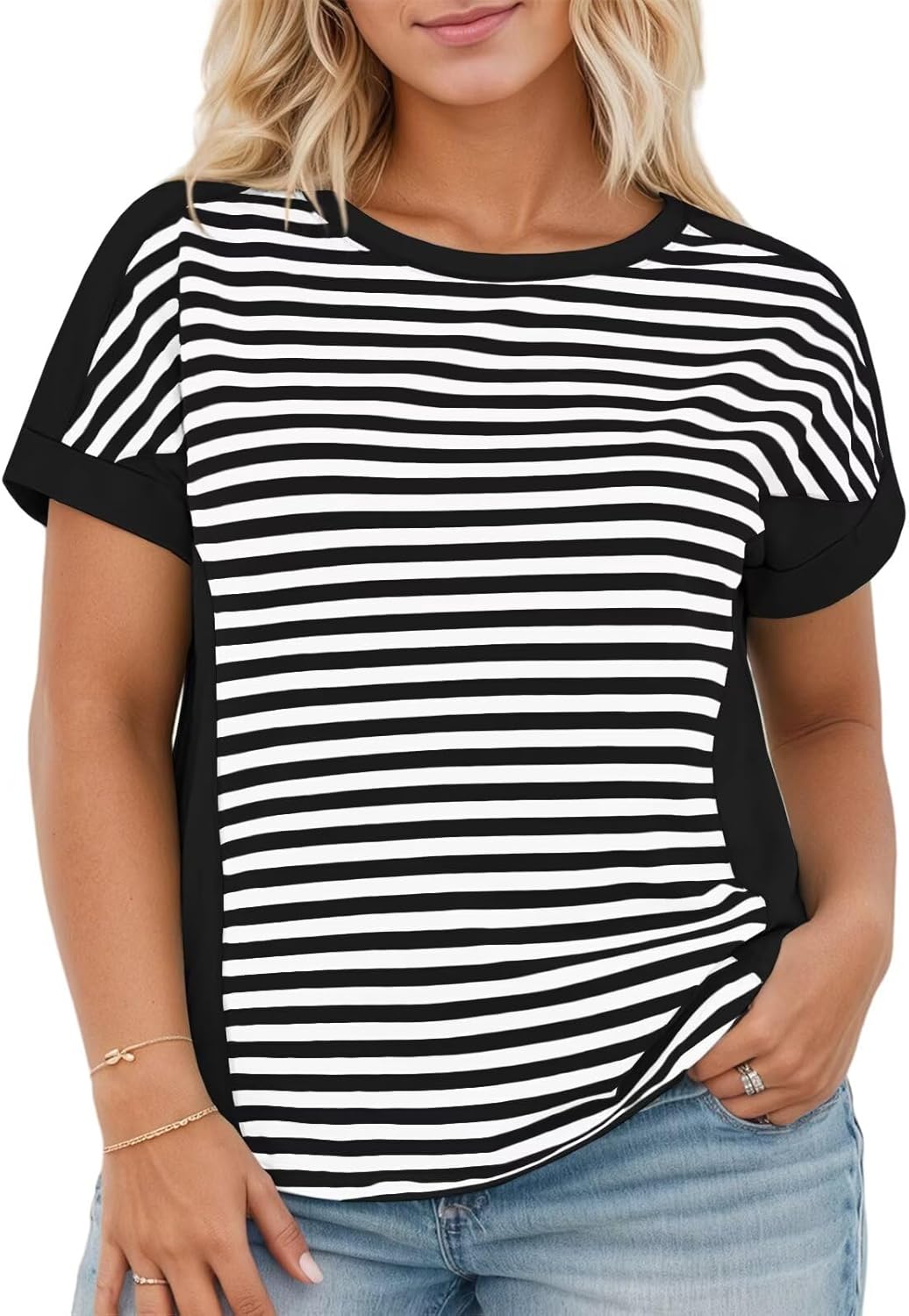 VISLILY Womens-Plus-Size-Summer-Tops Casual Striped Color Block T Shirts Crewneck Short Sleeve Workout Tees Loose Blouses
