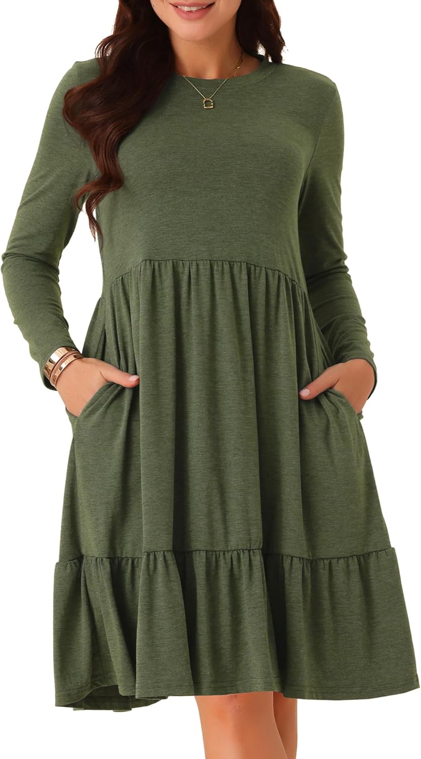 Seta T Women's Casual Long Sleeve Tiered Round Neck Beach Vacation Loose A- Line Swing Dress with Pockets