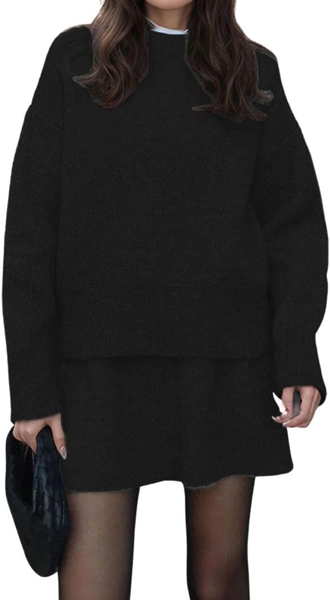 chouyatou Women's 2 Piece Sweater Skirt Sets Casual Loose Pullover Tops Mini Knitted Skirt Two Piece Outfits